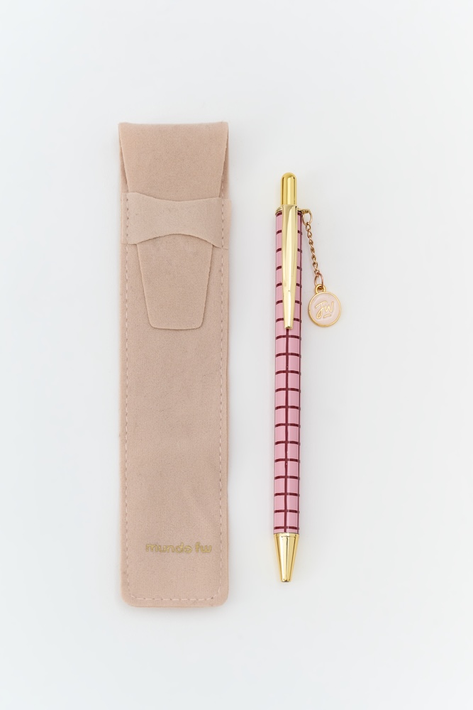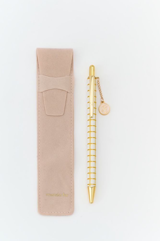 Bolígrafo retráctil con tinta azul con charms dorados. Incluye funda de velvet para un toque elegante y sofisticado.