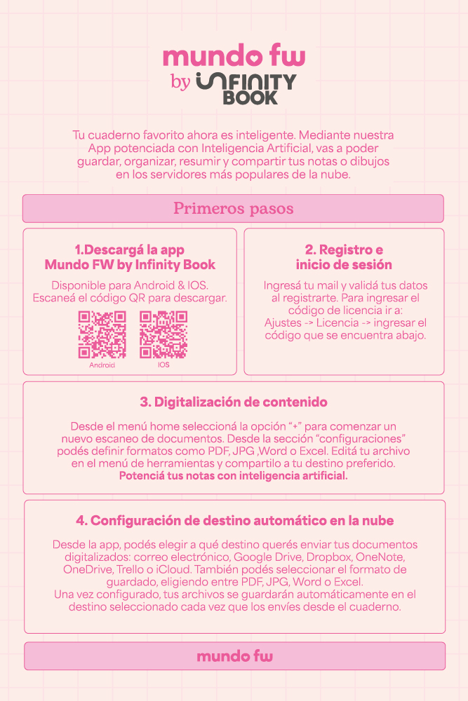 Cuaderno A4 semirrígido potenciado con tecnolgia inifity book, impreso sobre cartulina glitter. Su interior es rayado, ideal para organizar apuntes y tareas del día a día. Incluye hoja de datos personales, planner anual y planner semanal para una mejor planificación.