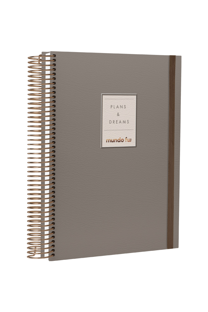 Cuaderno A5 tapa dura potenciado con tecnologia inifity book con interior rayado. Tiene detalles en reliev y cubierta de Pu que destacan su diseño. Incluye sobre interior para guardar papeles, hojas con borde en tres colores y secciones de información y datos importantes. Cuenta con planner anual y semanal