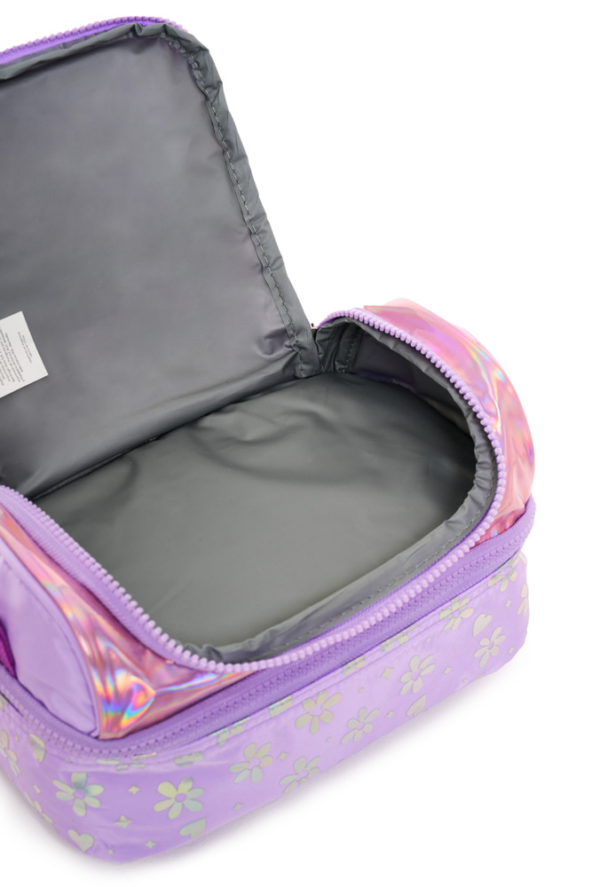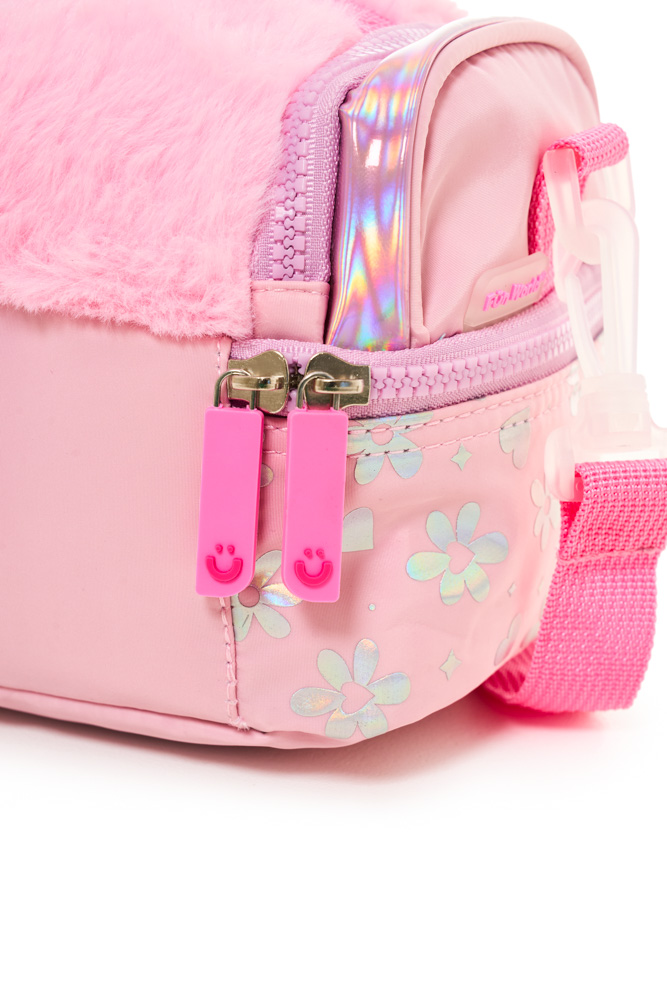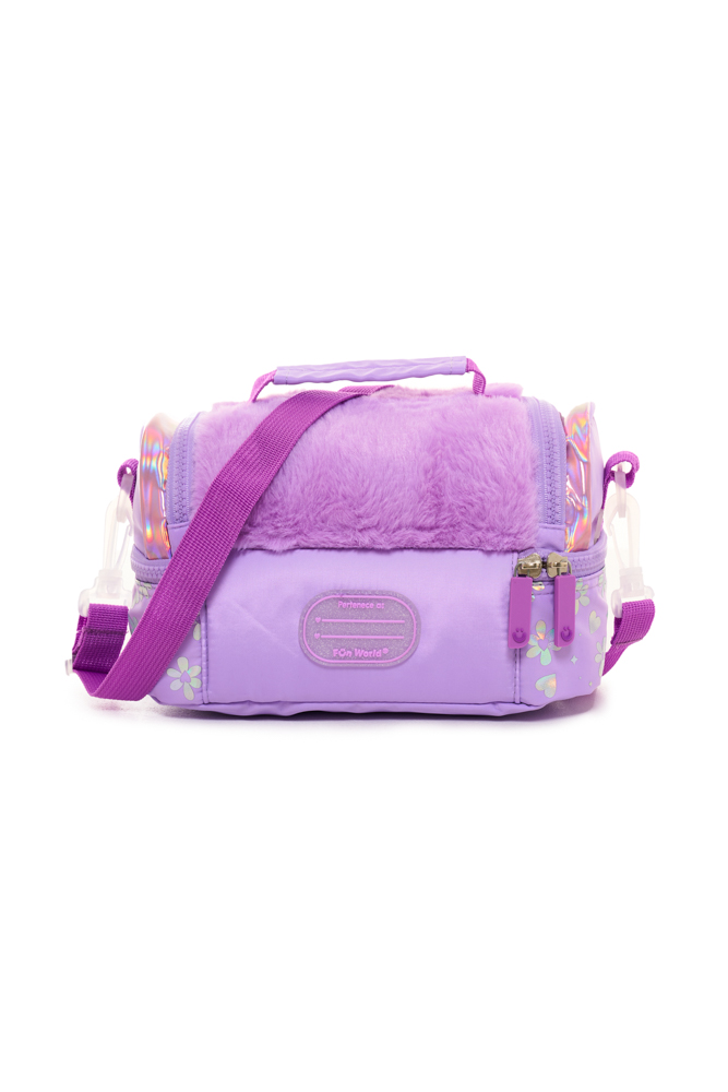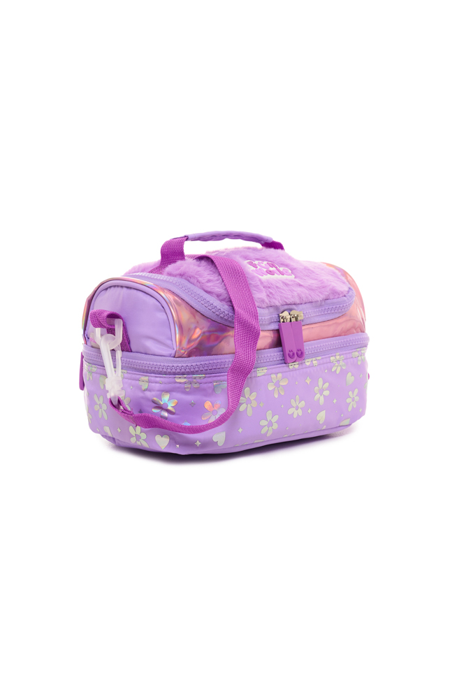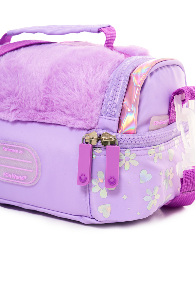 Lunchera lovely Confeccionada en tela de peluche y tela holográfica estampada, combina textura, brillo y practicidad en un diseño moderno. Dimensiones: 24x14,5x13,5 cm. Compartimento superior con apertura frontal. Compartimento secundario con apertura 180°. Correa corta de mano. Correa de hombro ajustable y desmontable. Interior impermeable y aislante.