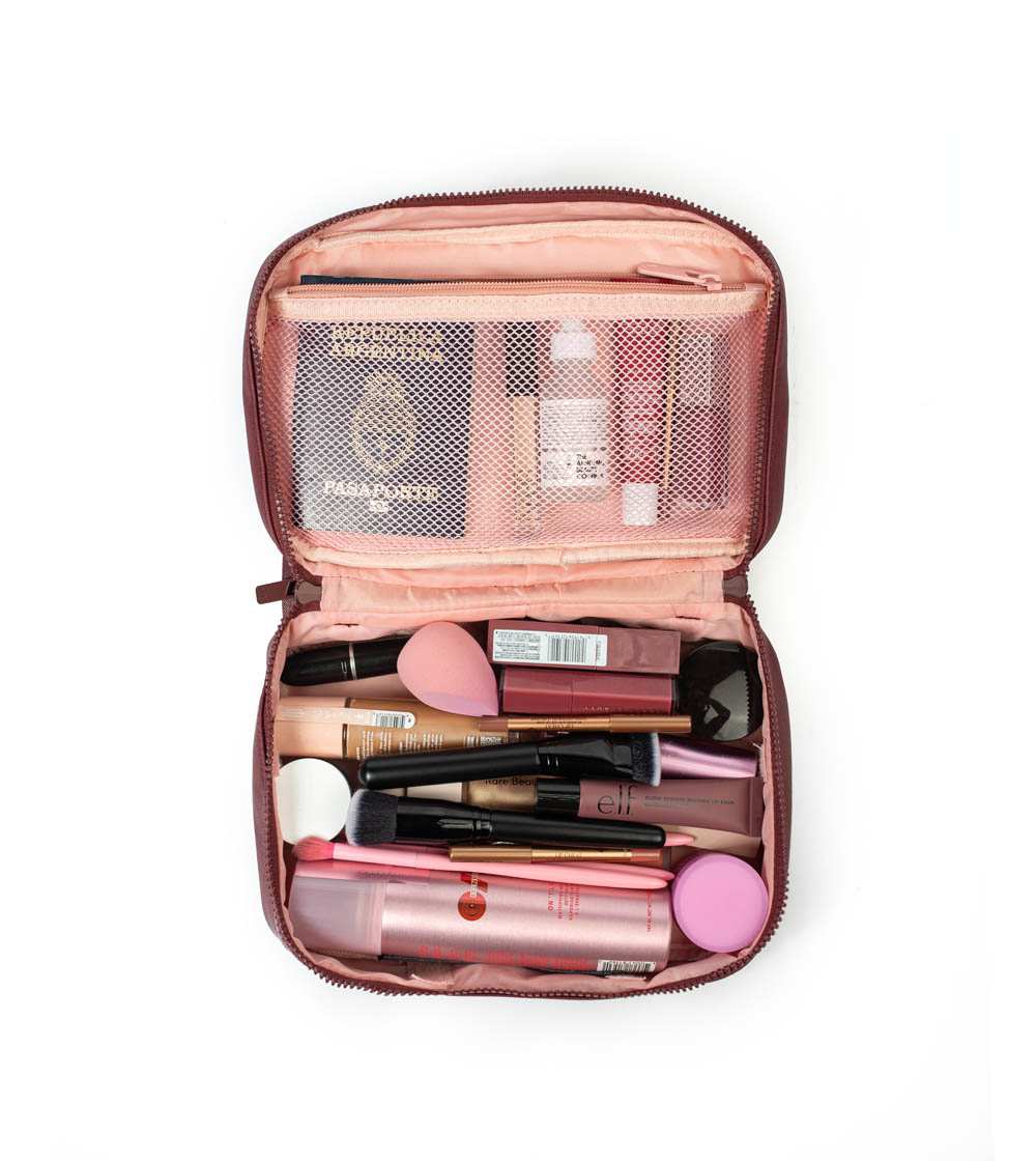 Organizador Ginebra ft FW de formato compacto, con organización interna, compartimento superior y uno secundario con apertura de 180°, más manija superior para fácil traslado. Variantes de color: rosa y bordo.