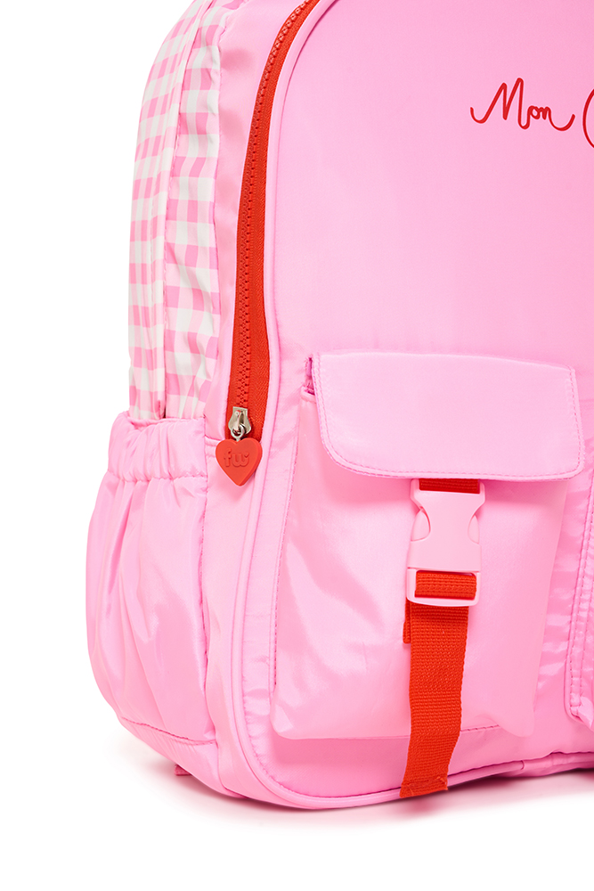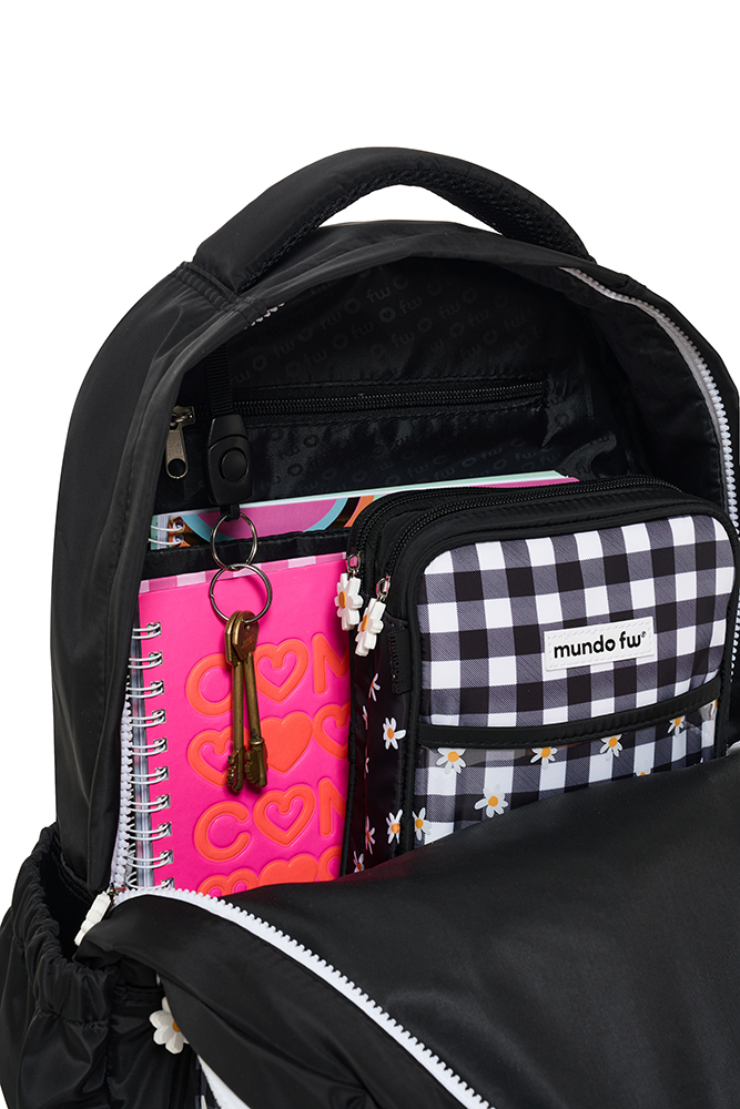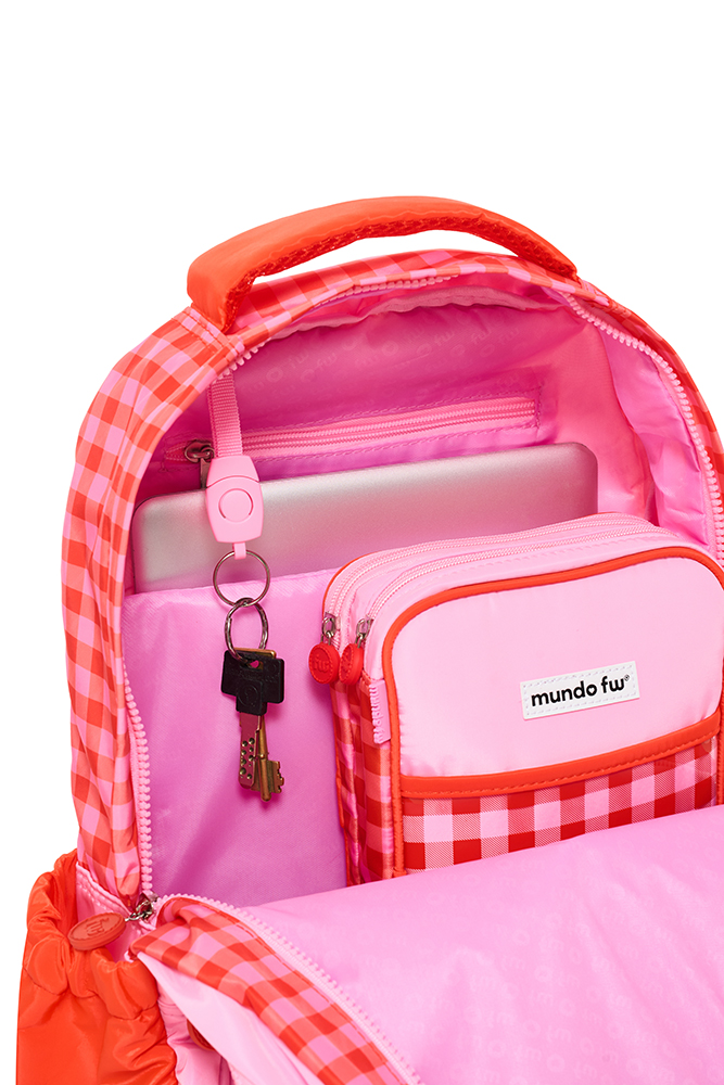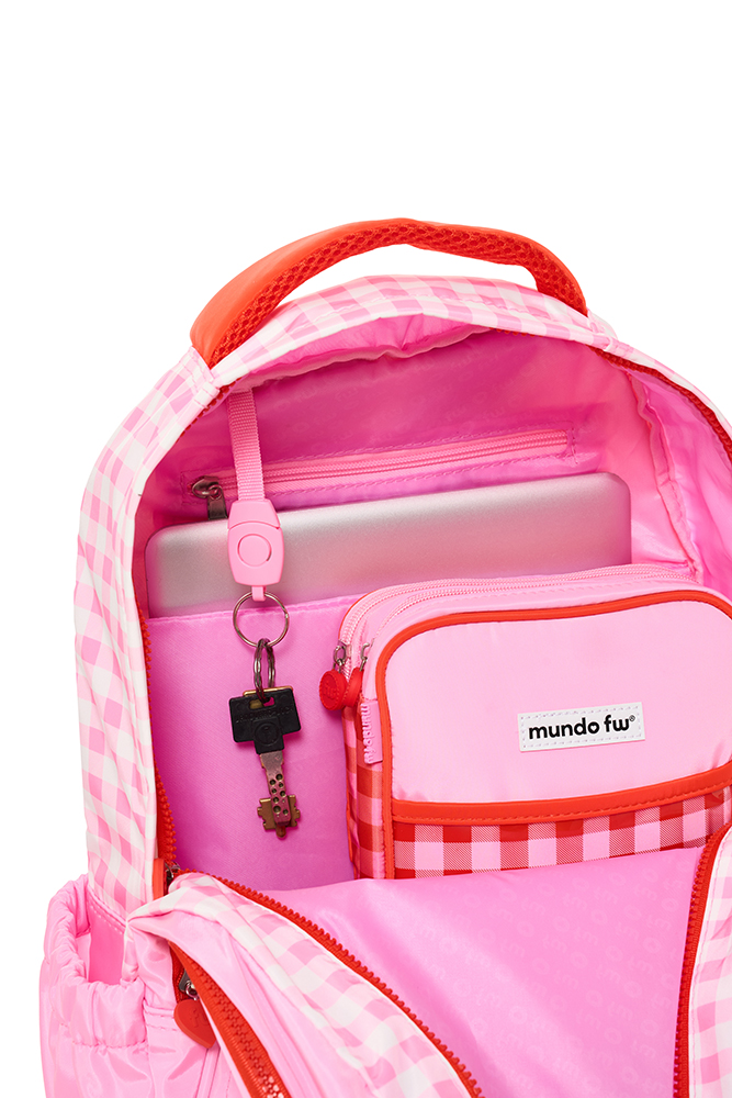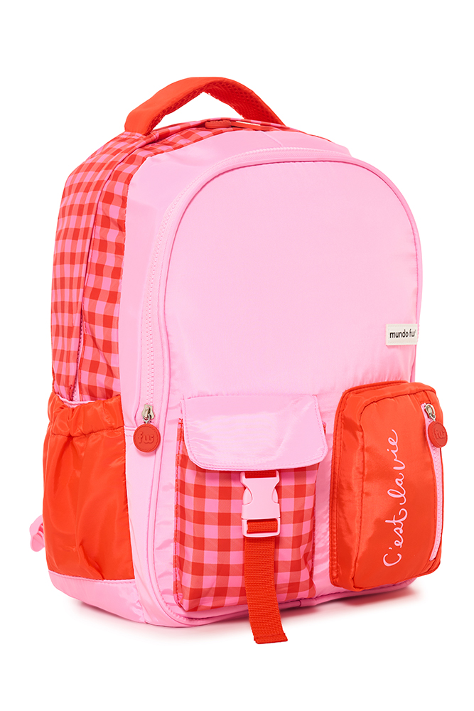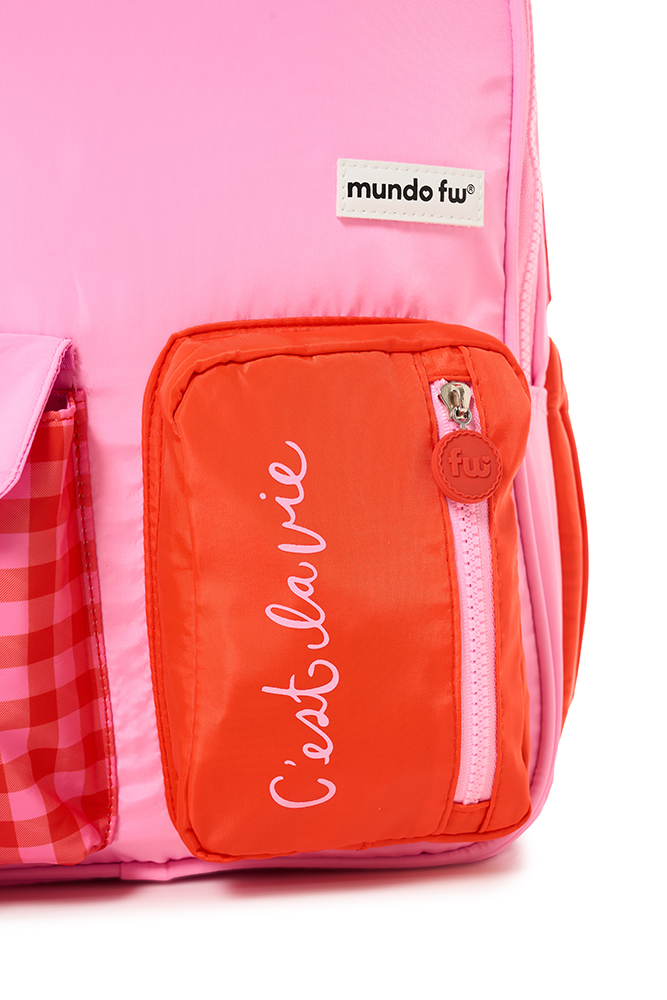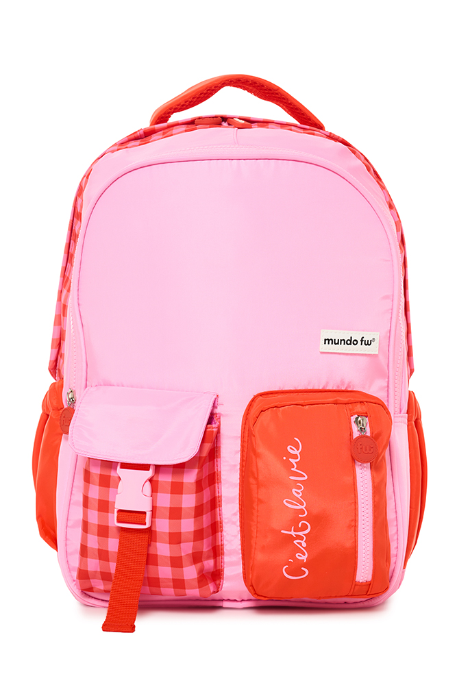 Moderna y versátil, pensada para acompañar el día a día con comodidad y estilo. Cuenta con un compartimento principal con bolsillo interno para notebook, bolsillo con cierre y clip para llaves, además de un segundo compartimento. Incluye dos bolsillos frontales —uno con solapa y otro con cierre—, dos bolsillos laterales y espalda acolchada para mayor confort. Su espalda con sistema air mesh.Disponible en tres variantes de color: rosa con rojo, negro y rosa.