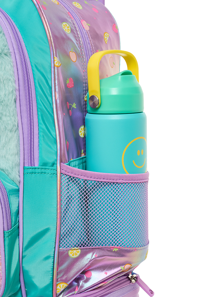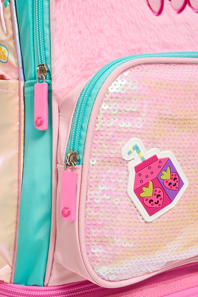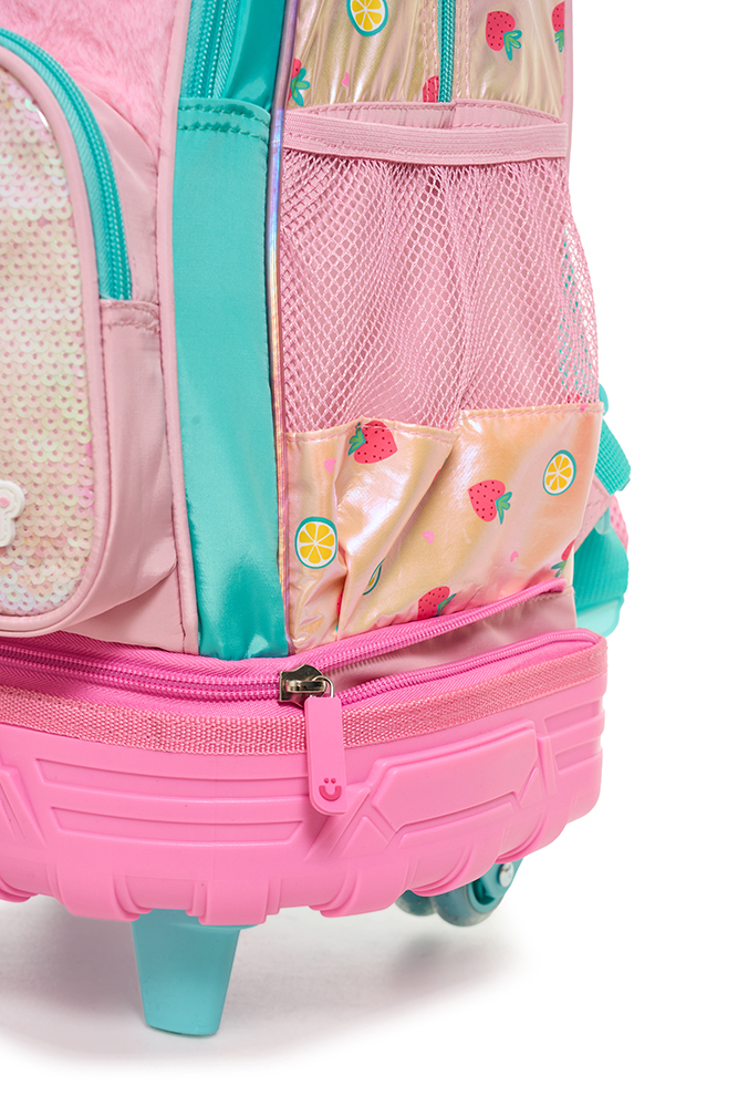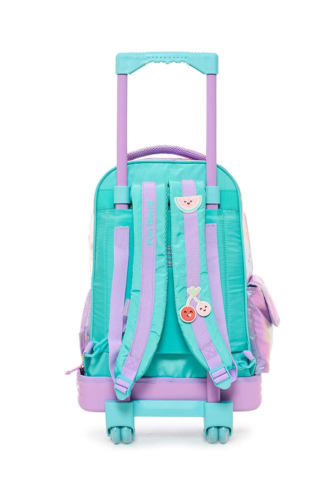 Mochila con carro 18” Fresh Confeccionada en tela holográfica estampada, combina textura y brillo en un diseño funcional y moderno. Incluye bolsillo de lentejuelas, parches de goma con velcro intercambiables, llavero con accesorio y detalles en tela peluche. Tiene parches cocidos en las correas, que suman estilo y personalidad. Incluye un práctico bolsillo lateral para llevar la botella siempre a mano. El carro es desmontable y reforzado, con dos pares de ruedas dobles que garantizan mayor estabilidad y resistencia. Disponible en dos variantes de color: rosa y acqua. Ideal para acompañar a los niños cada día con estilo y comodidad.