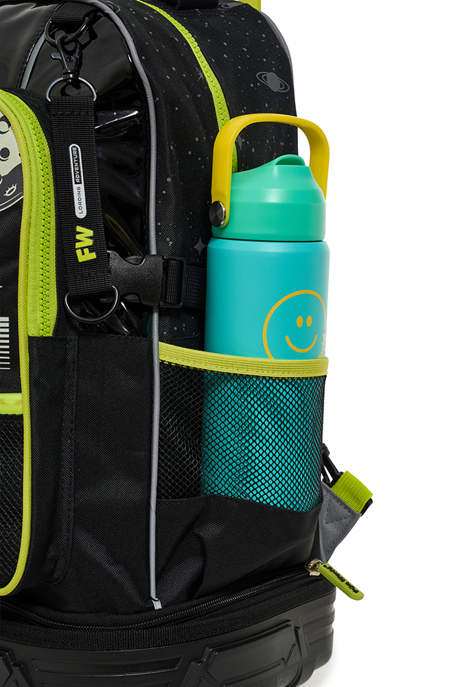 Con diseño moderno y detalles únicos, combina funcionalidad y estilo. Incluye parches de goma con velcro intercambiables, tinta que brilla en la oscuridad, bolsillo frontal con red y cierre impreso, además de varios bolsillos y compartimentos. Cuenta también con bolsillo lateral para colocar la botella.